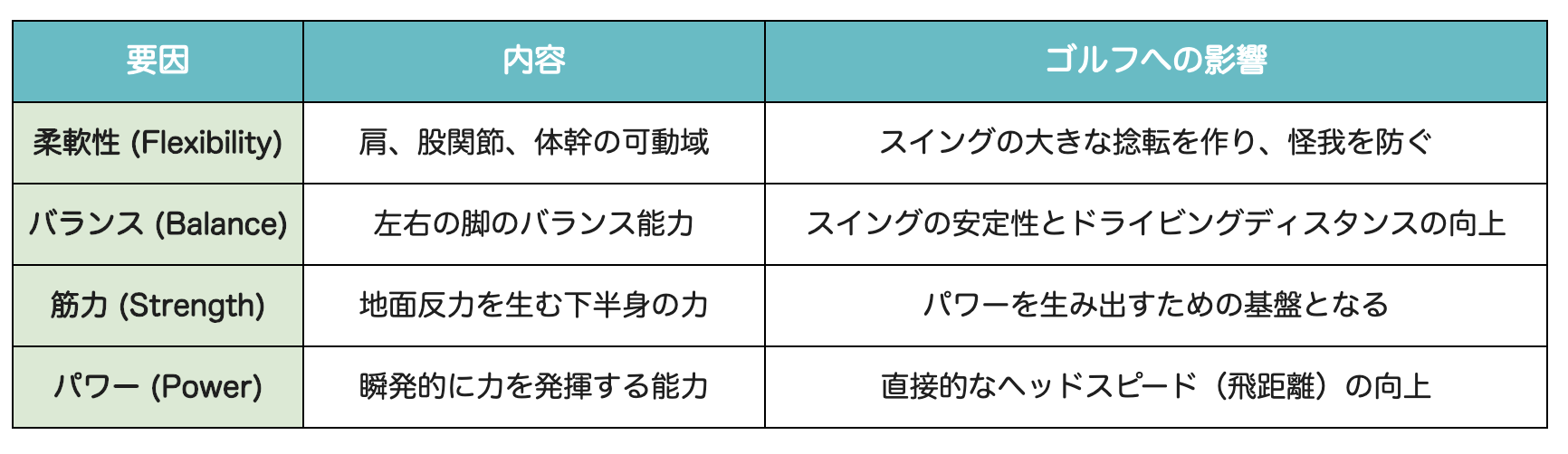ゴルフスイングのパフォーマンス、特にヘッドスピードに関連する身体的な要因は、大きく以下の様に分けられます。